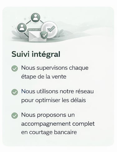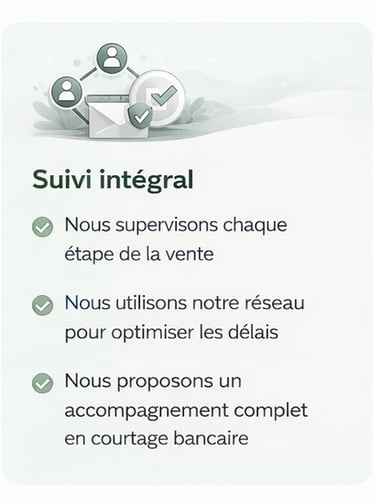 Nous vous apportons un suivi intégral de A à Z pour la vente de votre bien ainsi que des conseils immobiliers, financiers et bancaires. Bénéficiez également gratuitement de conseils pour optimiser ou développer votre Patrimoine.